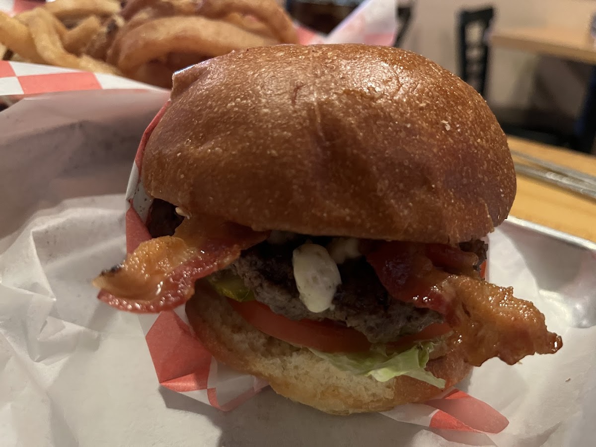 I must admit, I didn’t have high hopes for this place at first, initially thinking it was just another run-of-the-mill burger joint. However, I was pleasantly surprised—it’s so much more than that! The ambiance features a unique tiki vibe, complete with vibrant decor and a lively atmosphere that sets the stage for a fun dining experience. We were primarily there for the burgers, and I highly recommend arriving early, as I’ve heard the wait can get quite lengthy, especially during peak hours. We decided to plan our dinner for 5:30 PM, which turned out to be a perfect choice as we managed to avoid the crowds. We shared the "Bacon Me Crazy" burger and the "Tri Fry." The burger was absolutely mouthwatering, loaded with crispy bacon and delicious toppings that complemented the juicy patty perfectly. The "Tri Fry," a generous platter of fries, was definitely enough to satisfy five light eaters—each bite was crispy and flavorful! And let’s not forget the onion rings—they were absolutely to die for! Crispy on the outside and tender on the inside, they were the perfect side to our meal. Overall, I would highly recommend this spot if you’re visiting the area. With its delightful atmosphere, delicious food, and friendly service, it’s a hidden gem that you won’t want to miss!
