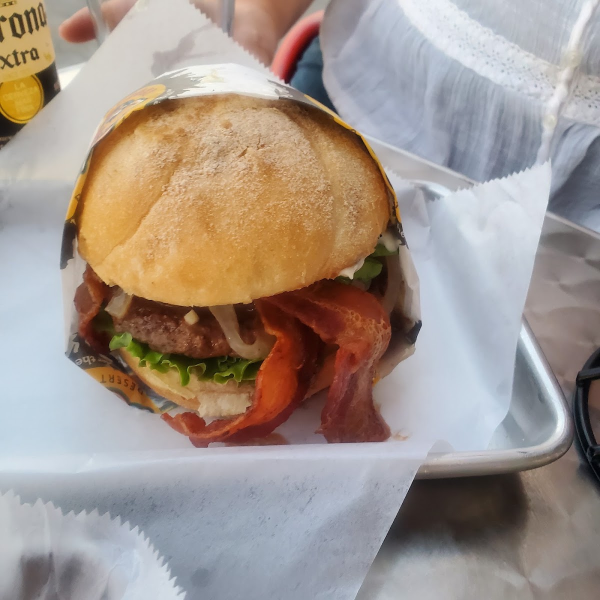 Very good burger in Palm Desert. Popular place, with friendly staff. First time here, so I got the basic as not to cloud my tasting with all sorts of toppings. My burger was the basic cheddar cheese, tomato, lettuce with mayo and mustard. It has a good sized hamburger patty, that is juicy for sure but not really seasoned much. Fries were medium cut and fried well, giving an old school diner type of taste. Companion ordered the chili burger, with onions. No beans in the chili, which is the best way to do it on a burger. They liked it very much. Place is kinda small and tight for the amount of business they are doing. But fun tropical tiki hut kinda theme. Everything is ala cart, and the burgers are in the $15 to $20 dollar range. Massive menu (see pics). Plenty of other options besides burgers too. All in all, I'd definitely go back.